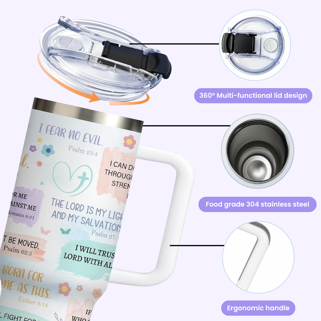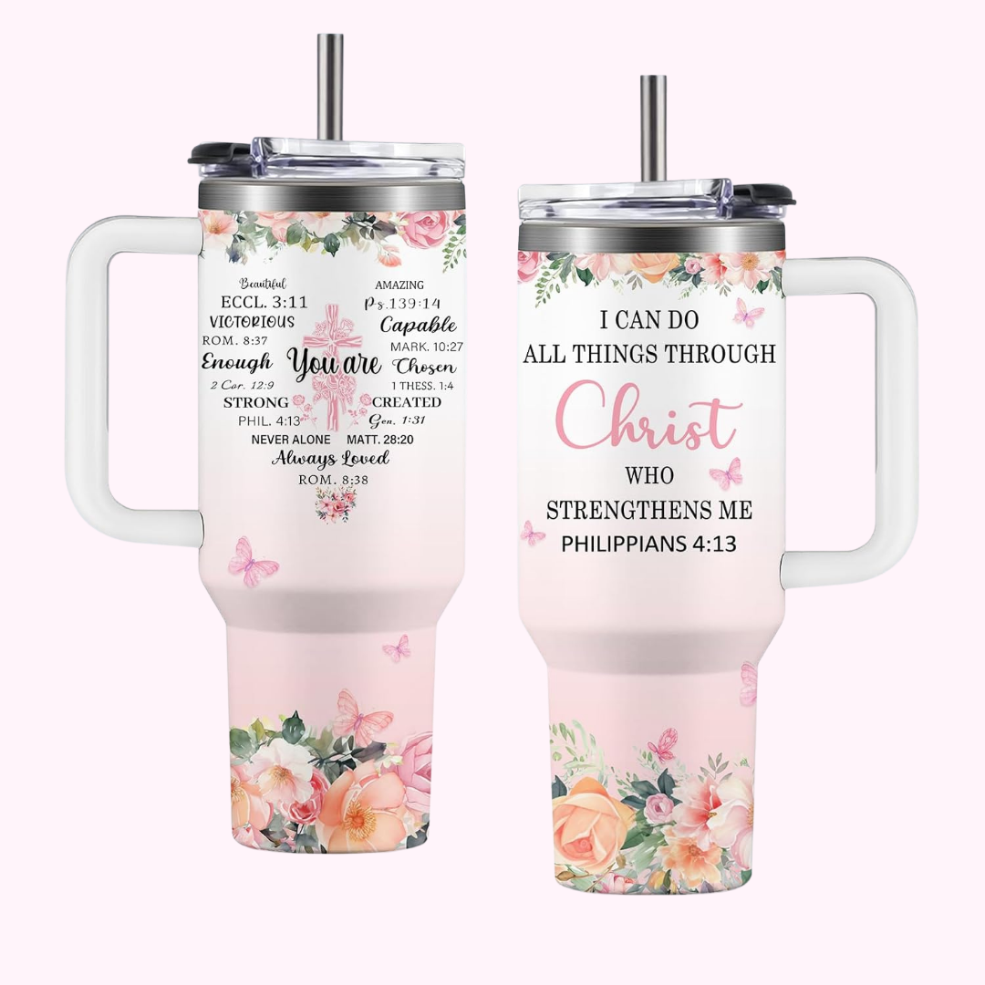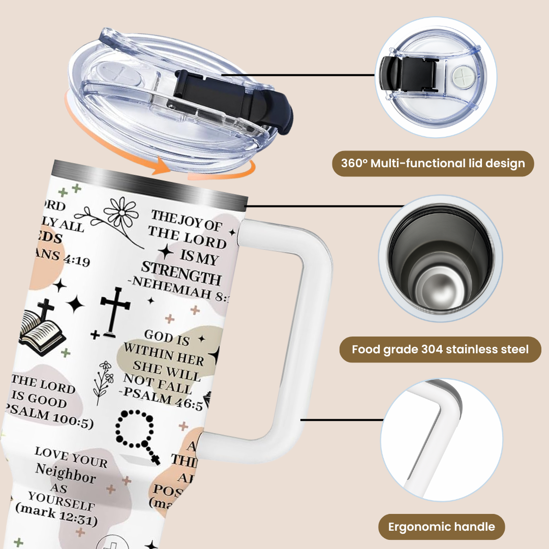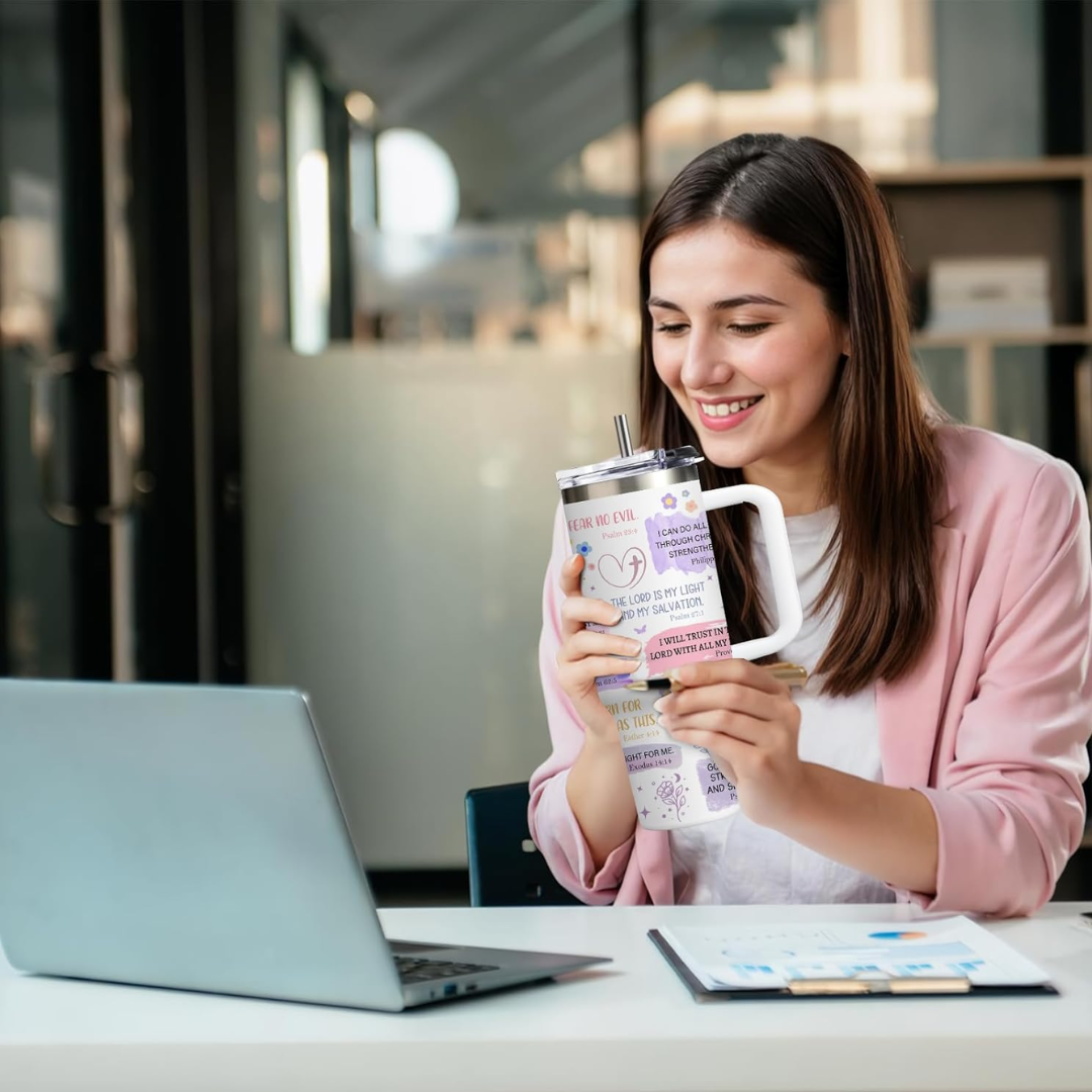 Our tumblers feature handpicked Bible verses and uplifting affirmations to keep your heart aligned with His Word from your morning coffee to your evening tea. Carry your faith wherever you go, one sip at a time.