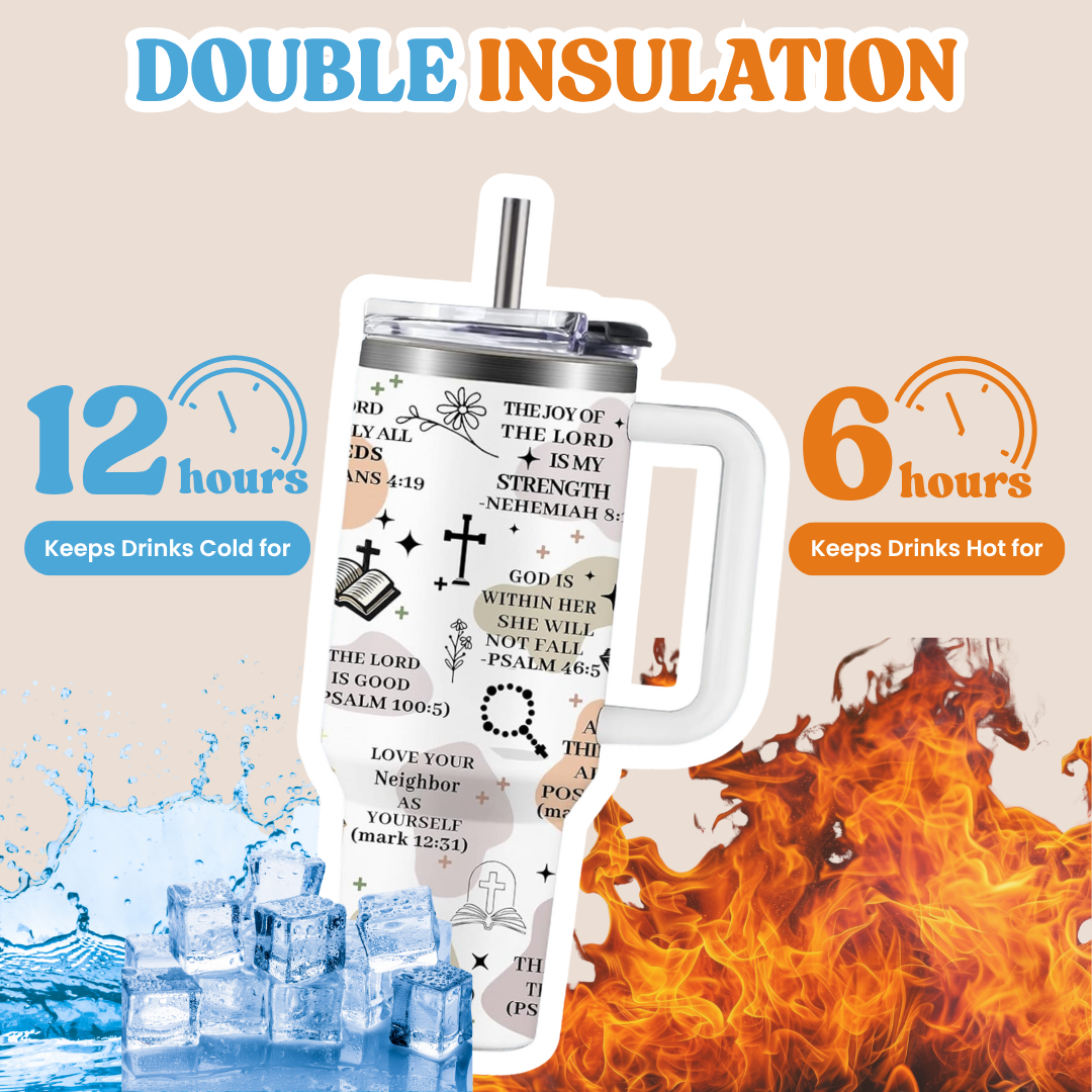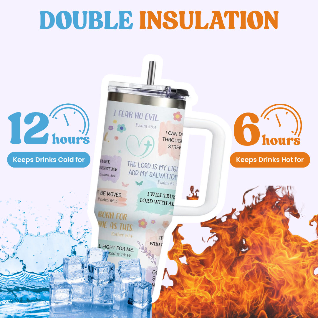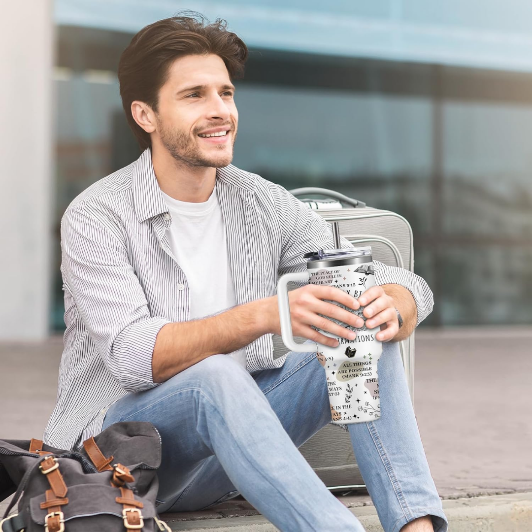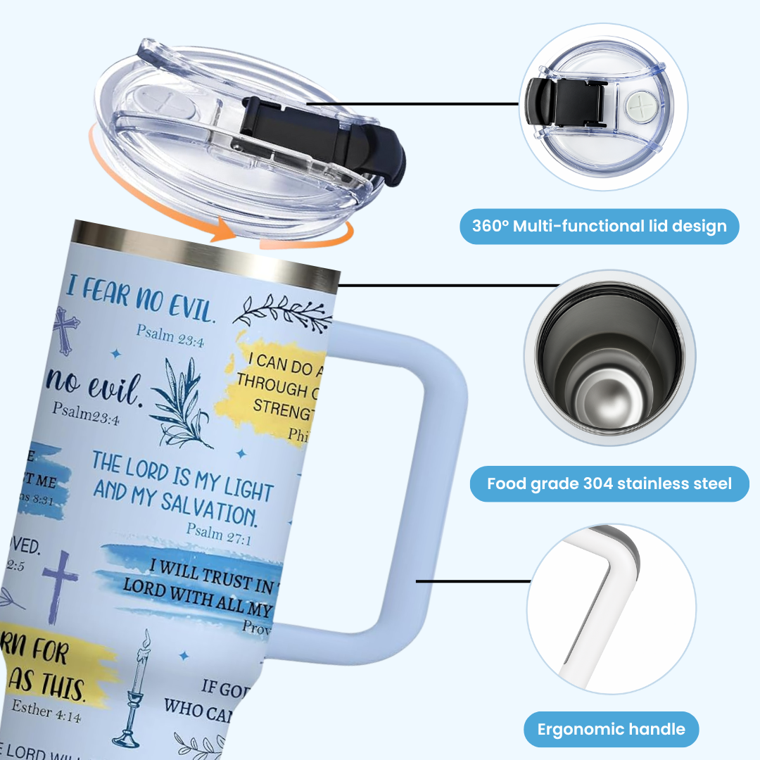 Our tumblers feature handpicked Bible verses and uplifting affirmations to keep your heart aligned with His Word from your morning coffee to your evening tea. Carry your faith wherever you go, one sip at a time.