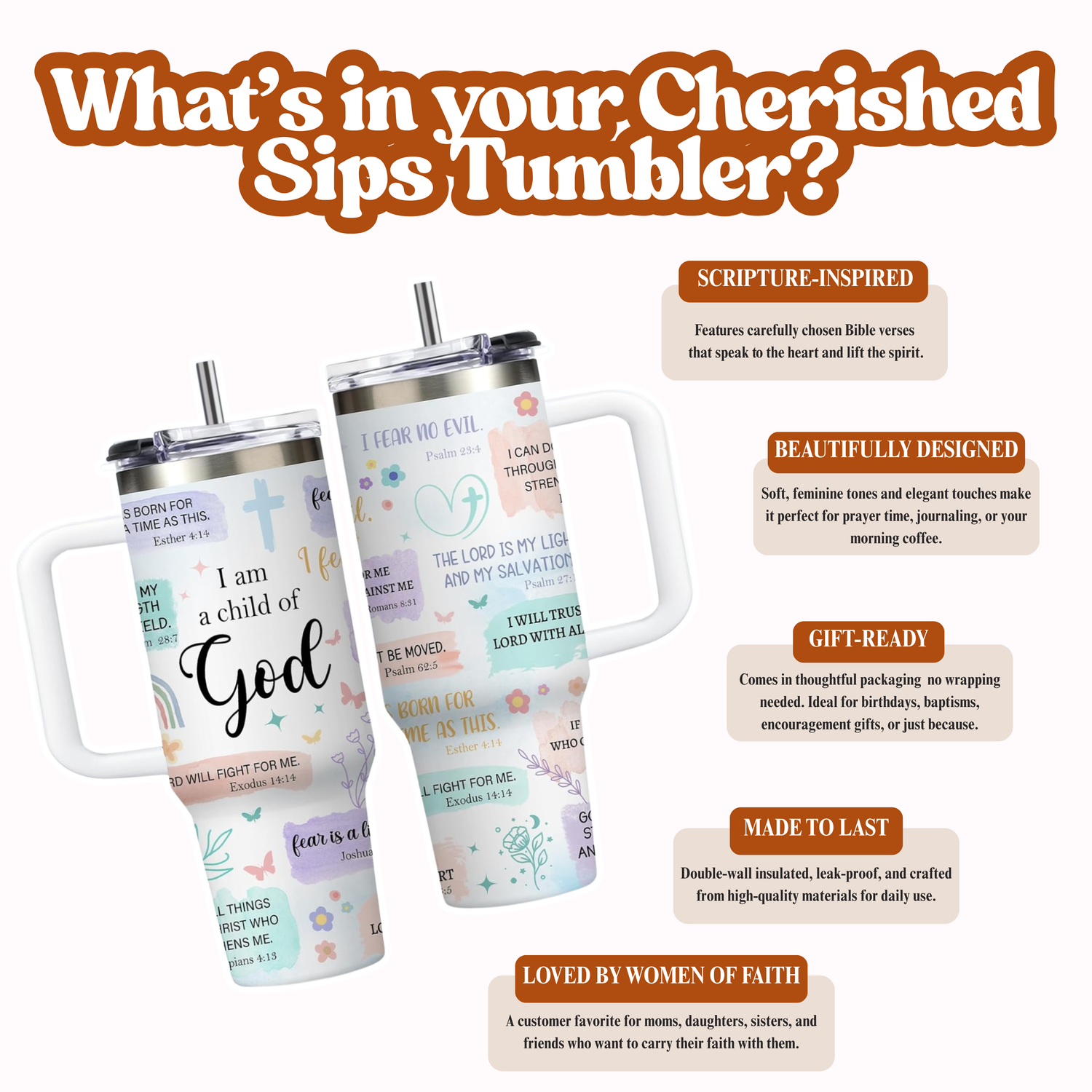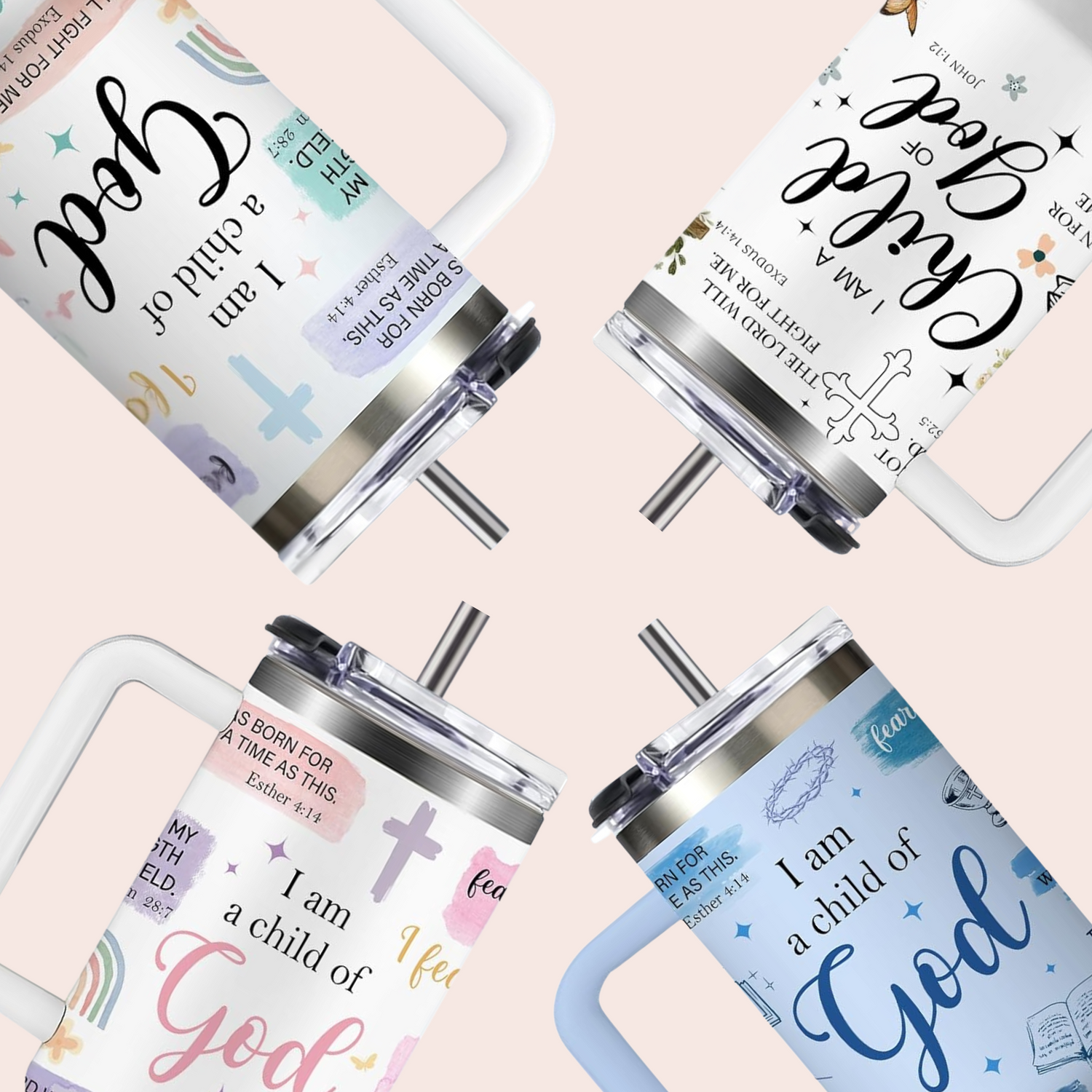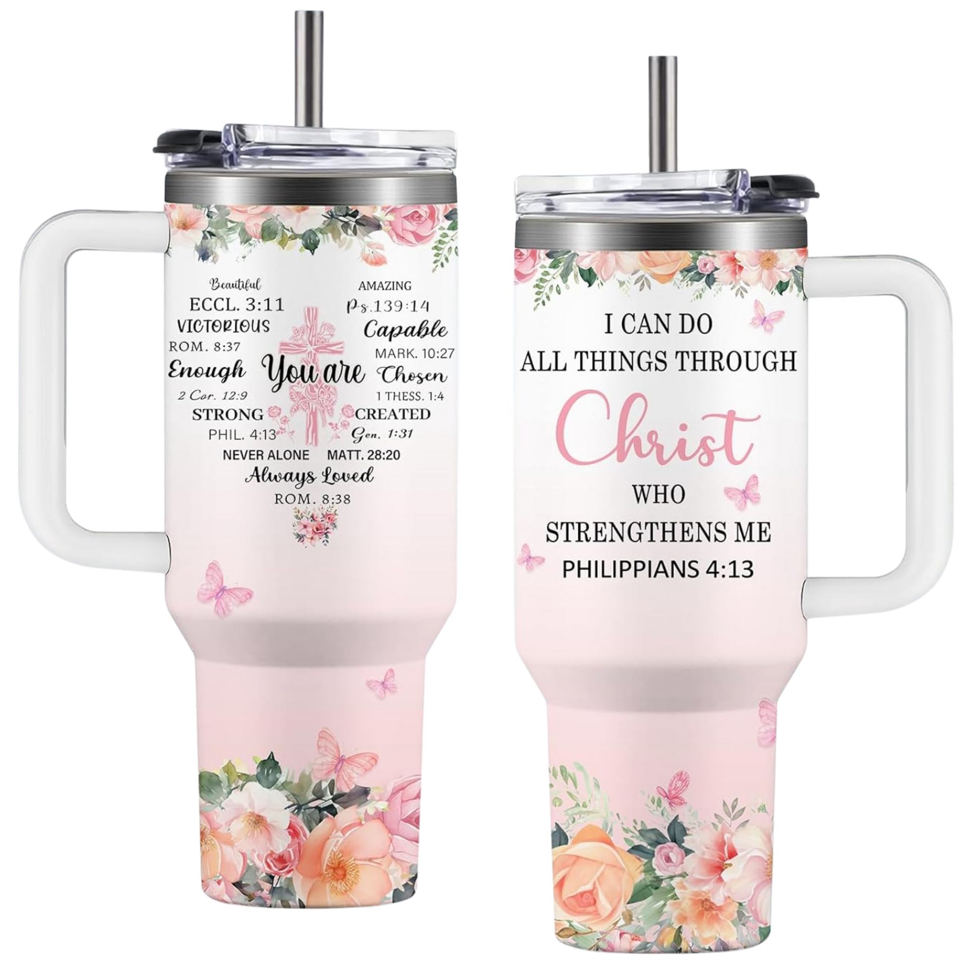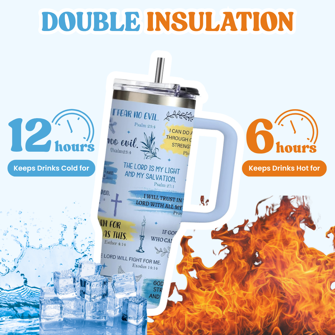 Our tumblers feature handpicked Bible verses and uplifting affirmations to keep your heart aligned with His Word from your morning coffee to your evening tea. Carry your faith wherever you go, one sip at a time.